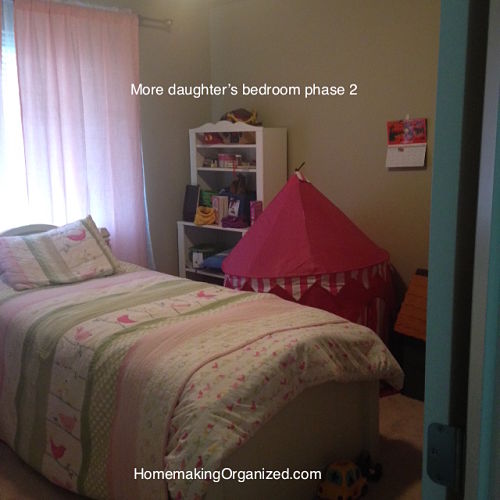 In my daughter's room she and I work during the day. I move the furniture or give her a task to do and she fine tunes it. Her flowy curtains will go back up soon.