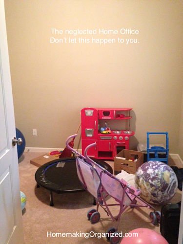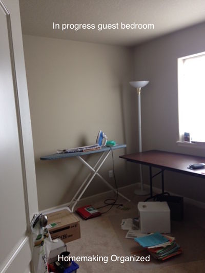 He insisted he wanted to be near us in the craft/homeschool room on the second level so he initially took the guest room for his office. As a result this room became a junk room. We tossed boxes from packages in here, workout equipment and my daughter brought her friends in here to play.