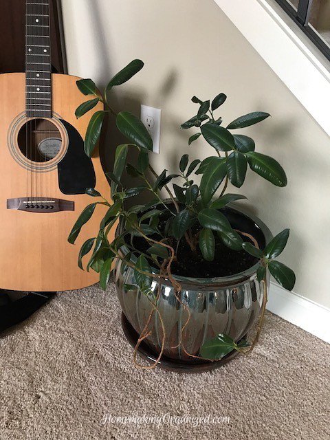 I just love what plants do a for a room!  A little green goes a long way to making a room decor inviting and fresh.  Plants are easy to get a hold of too! You can probably get a piece from a friend to grow your own plant. All but 2 of the plants in my home have come from another plant at a friend or family members. My biggest plants, the corn plant, came from my mother's plant which was originally from a friend of hers. Hers is currently a nice tall plant that makes a statement in her